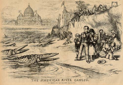 An example of anti-Catholic and anti-Irish propaganda from the 19th Century Nativist movement. In this political cartoon, Protestants try to protect their families from “Catholic crocodiles.” Anti-immigrant sentiment is still used to divide the poor along racial and ethnic lines. Image from Harper’s Weekly, 1871.