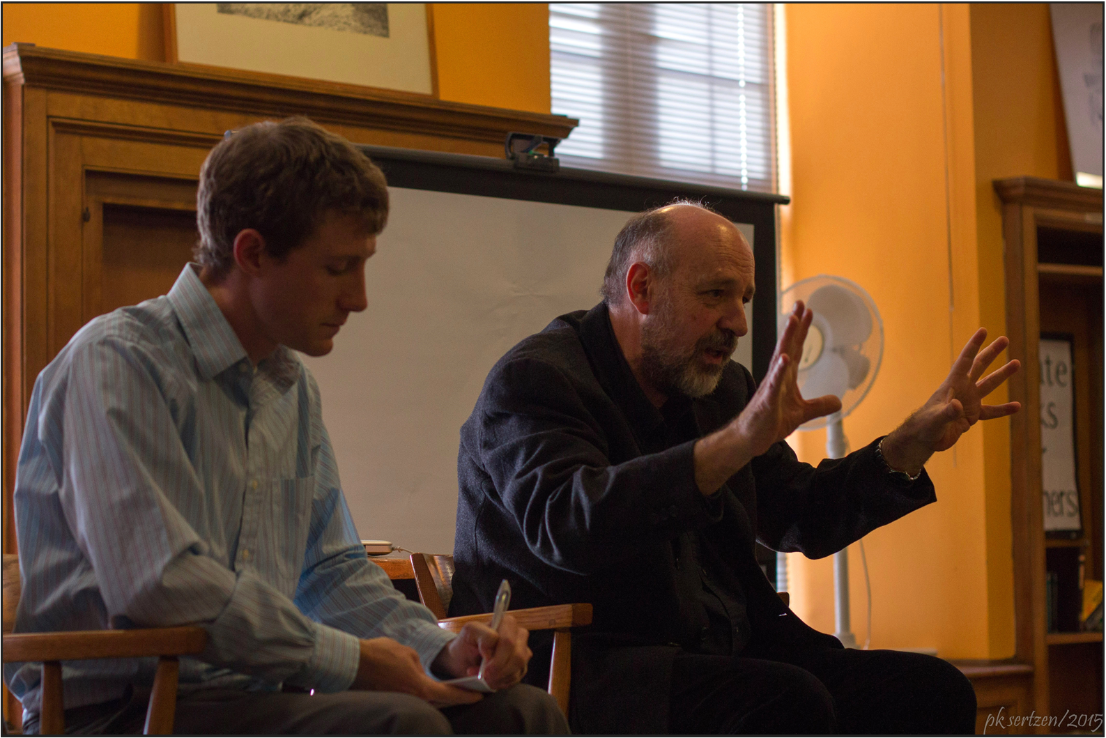 Opinion editor and columnist at Mexico City’s daily La Jornada, Luis Hernandez Navarro, speaks at Cornell University March 16. Interpreting at left is CUSLAR Coordinator Tim Shenk.