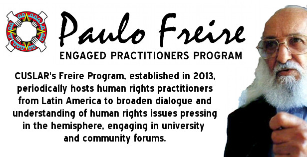 CUSLAR’s Paulo Freire Engaged Practitioners Program was established in September 2013 and periodically hosts human rights leaders from Latin America to broaden understanding and dialogue around pivotal issues. These practitioners share their experiences through lectures and dialogue with students, faculty and community organizations.