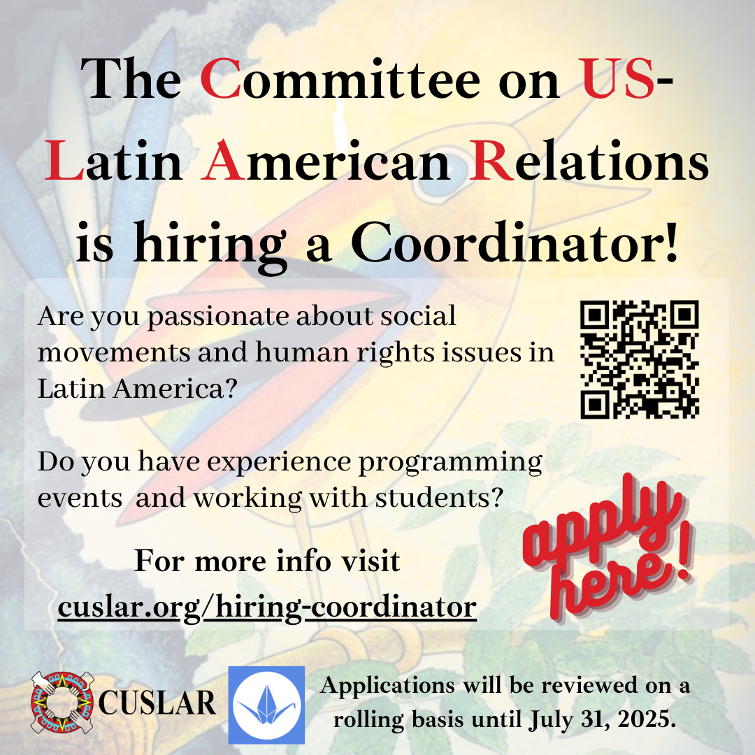 Qualifications: The CUSLAR Coordinator will demonstrate their commitment to CUSLAR’s mission of contributing to peace, justice and mutual understanding in the hemisphere and have strong working knowledge of Latin America and U.S.-Latin American historical, political, and social relations. Candidates should have leadership, mentoring, communications, and cultural competency. Spanish language fluency preferred.